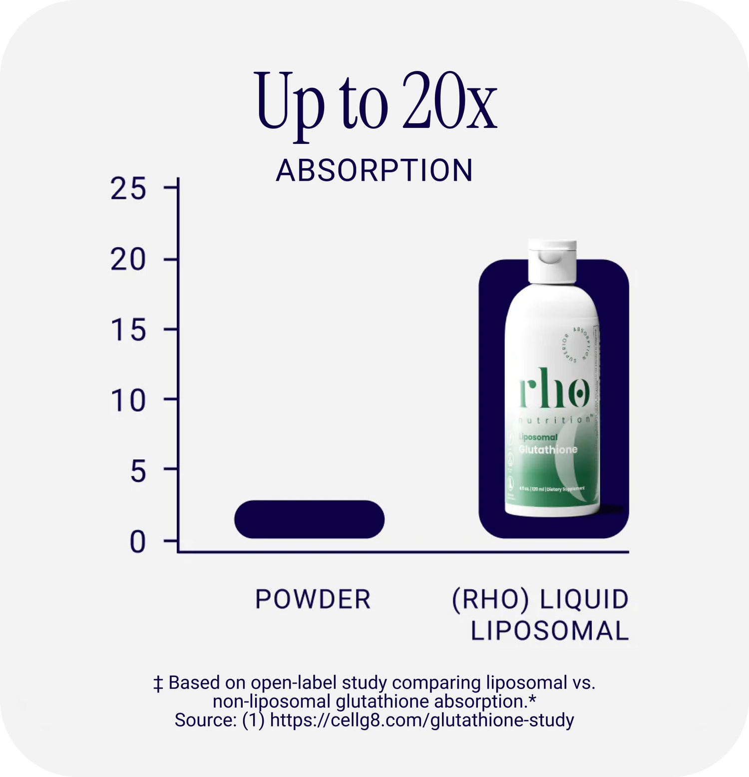 Rho's liquid liposomal glutathione has been shown in an open-label study to offer up to20x greater absorption into the bloodstreamcompared to non-liposomal powder forms, supporting more efficient nutrient delivery and availability.‡